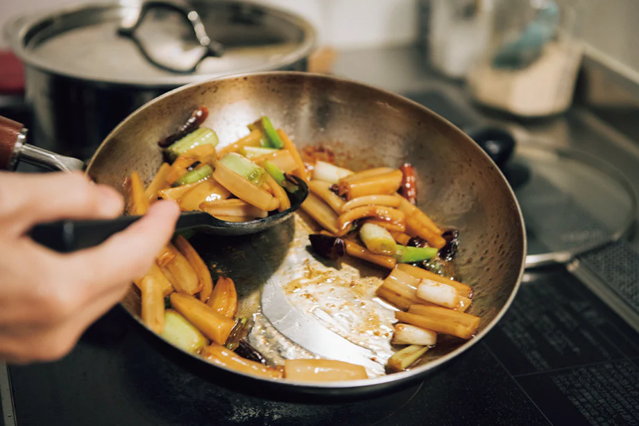「ベジになって、改めてスパイスや調味料を見直すようになりました。例えばレンコンと長ネギの炒め物は、八角と鷹の爪をたっぷり入れて醤油で味付けしたシンプルなものですが、組み合わせの妙で十分おいしくなる。一方で7、8種類のスパイスを使っていちから味を作るカレーも面白い。以前は気づいたら賞味期限が切れていた自宅のスパイス類を使い切れるようになり、料理人としての成長を感じています(笑)」