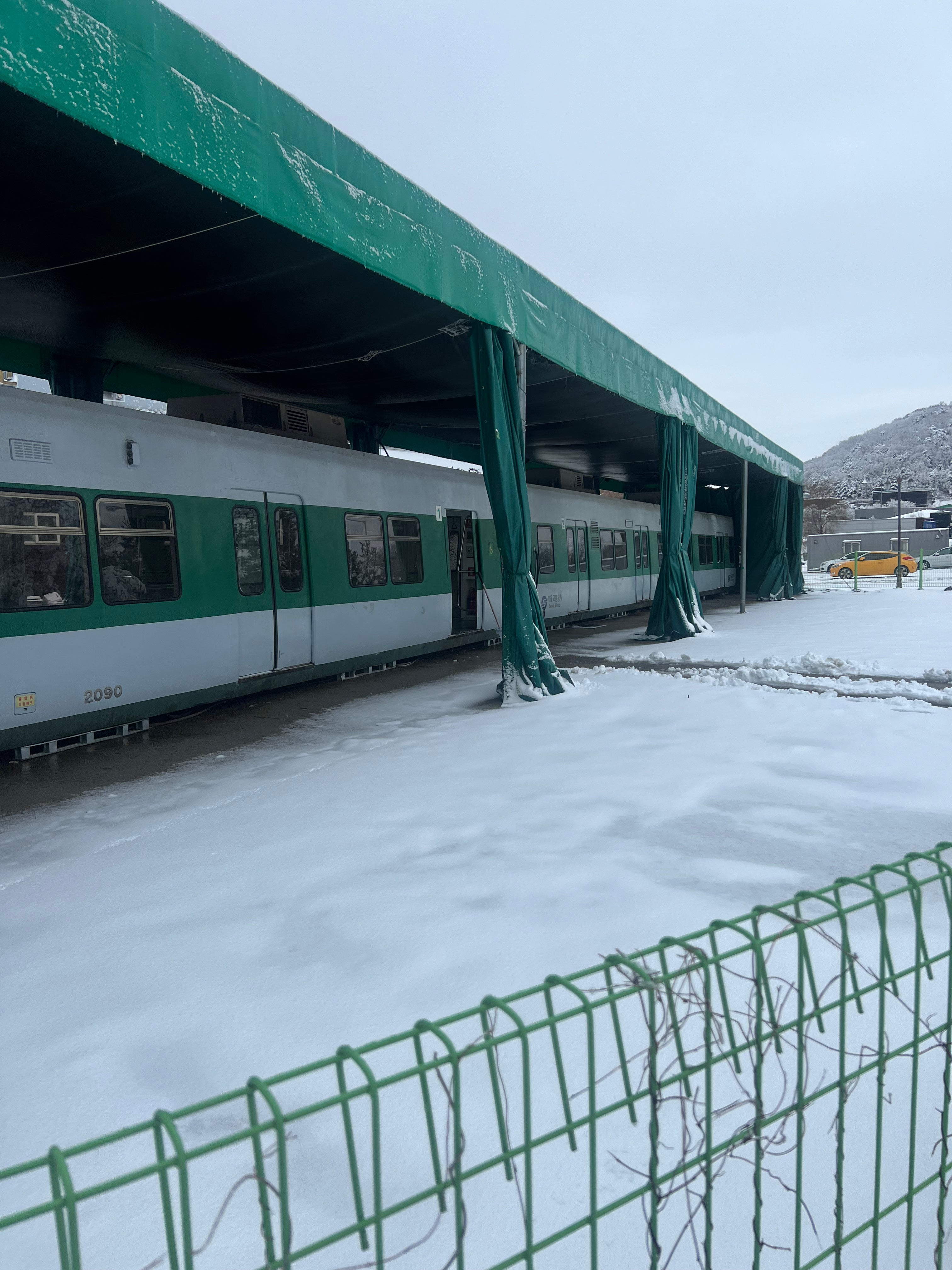 スタジオまでの道中、何もないところに突然電車のオープンセットが建てられていた。四方と天井をクロマキーカーテン(あとで背景をVFXで合成しやすくするためのグリーンバック)で囲めるようになっていて、おそらく過去に使われていた電車の車両を再利用しているのだと思うが、スタジオ内ではなく完全に外で、プレハブのようなところにあったのでびっくりした。渡韓前に、韓国の映像業界で働く方何人かにインタビュー取材をしたのだが、「とにかく一度やってみる」という精神、失敗を恐れずチャレンジする精神を言葉の端々から感じた。急拵えで作ったように見えるこの電車セットも、その精神の表れなのかもしれない(日本には自分が知る限りこういうものはないし、あったらいいなあと思う)