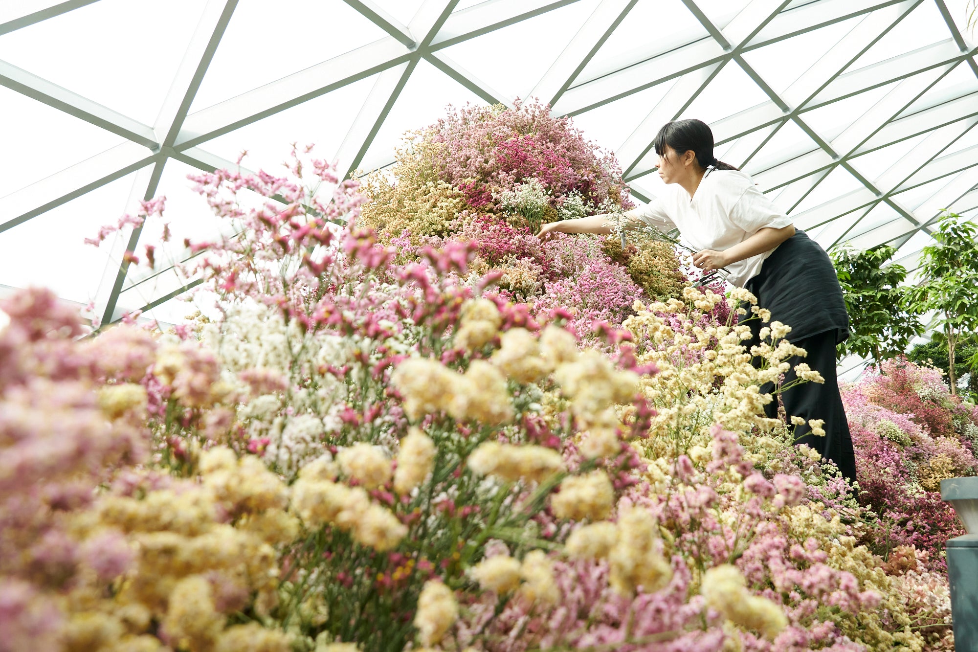 「あとは、お花の状態がいつもと違うことにもとても苦労した。赤道に近いシンガポールの気候で咲くお花の色は、濃く強い南国の色。でも表現したいのは、もう少し優しい感じの色味。今回の作品は、花材はすべて日本から輸出をするところにも重要なコンセプトがあった。でも、到着した時点でお花はシンガポールの湿気によりドライ化が進んでしまい、少し縮んでしまっていて、見た瞬間にボリュームが足りなかったのはすぐわかった。でも、制作に取り掛かったばかりで騒ぐことは、スタッフのテンションを下げたり不安にさせたりしてしまうので、自分だけの胸にぐっと堪え、制作に励みました」
