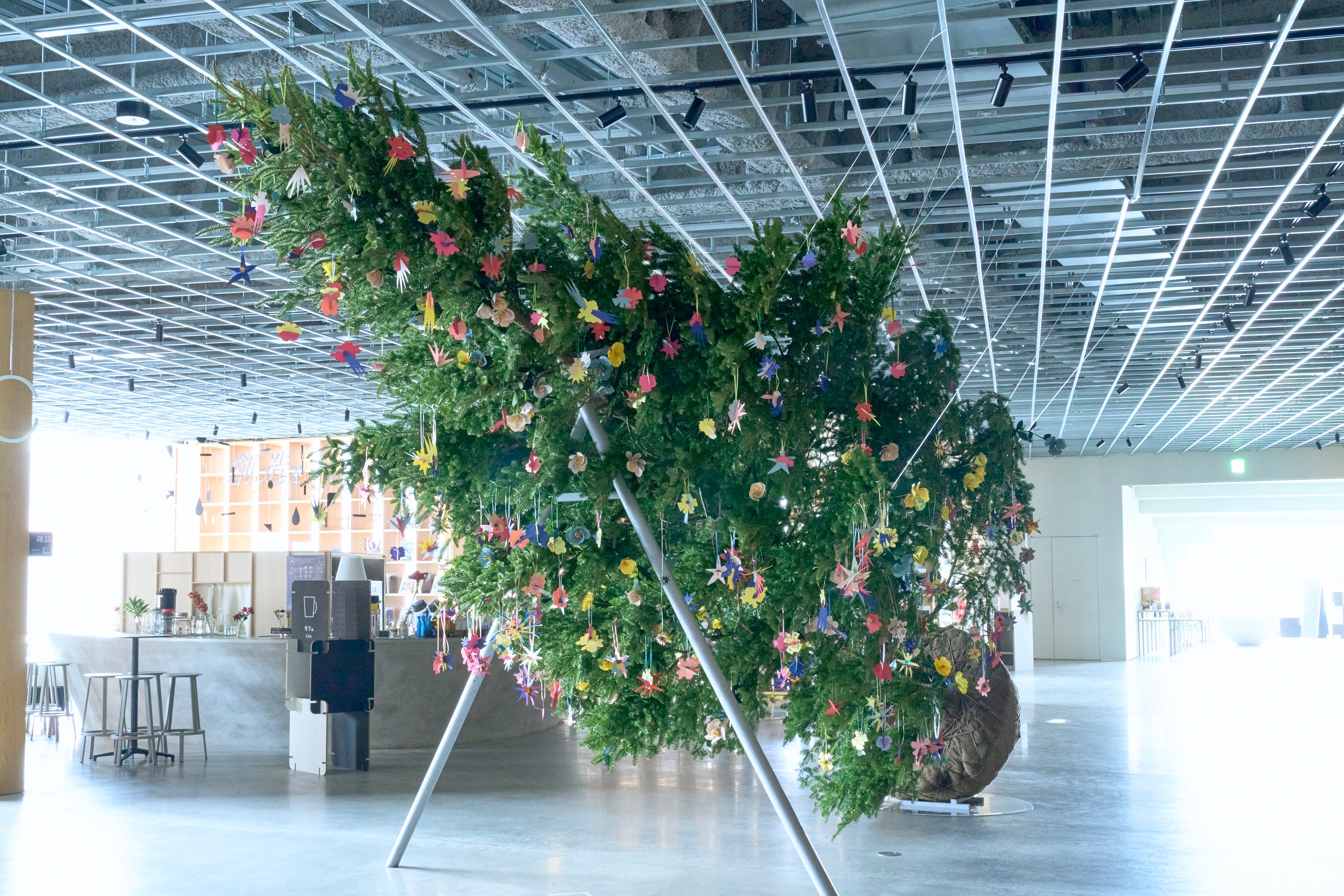 「子どもの頃に読んだ記憶がある『ガリバー旅行記』。人間が小人の島に漂流した…っていう。Gulliverって言葉を調べると、"圧倒的に巨大な存在だけど、本質は変わらない"という比喩があるみたいで。約八メートルのクリスマススリーって、人間の背よりもはるかに高くて、てっぺんの方は全然見えない。でも今回のインスタレーションでは横に倒すことで、通常の視点が変わって、木の全体が見えるようになる。巨大な木だけど、木であることは変わらないんだよって。そういう意味を込めた。そしてもう一つのテーマが、"PAPER EDEN"。私が2017年に発表した、紙で花を表現することを今回の"Gulliver tree"にも用いた。来場者が紙でお花の飾りを一緒に手作りして、"Gulliver tree"に咲かせていく、ひとつの作品をみんなで作って日々増えていく、そういう参加型のインスタレーションにさせてもらった」