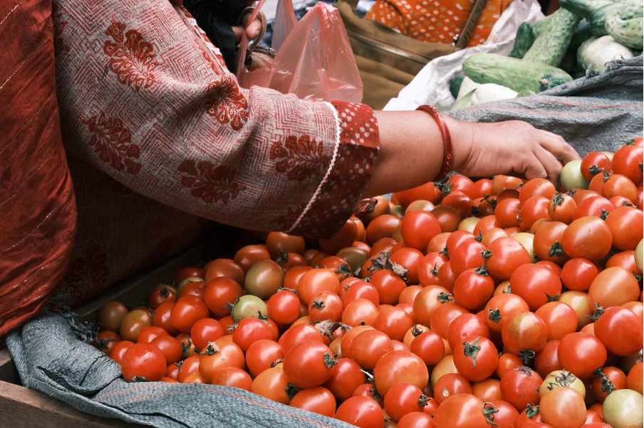 トマトを選ぶ手。