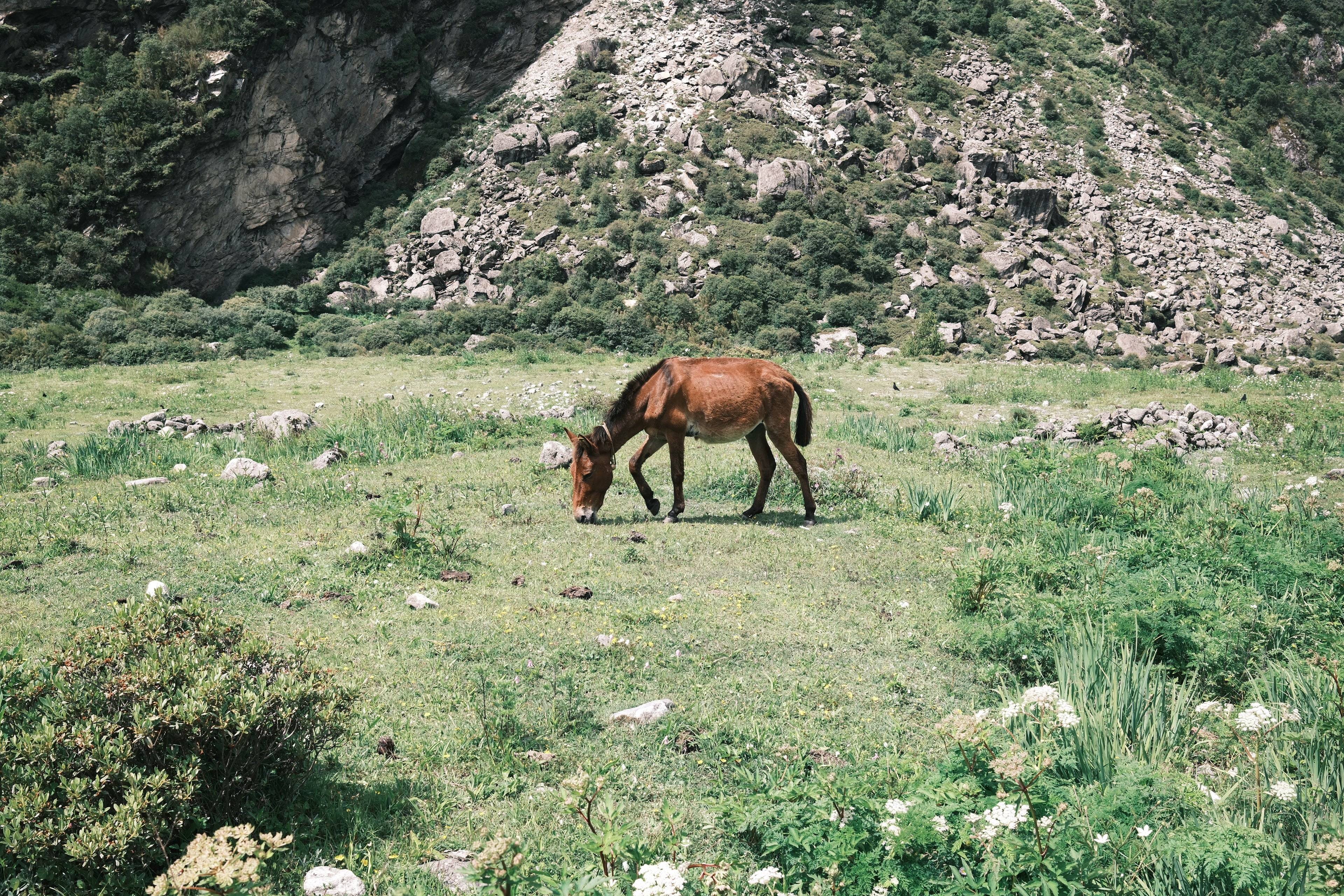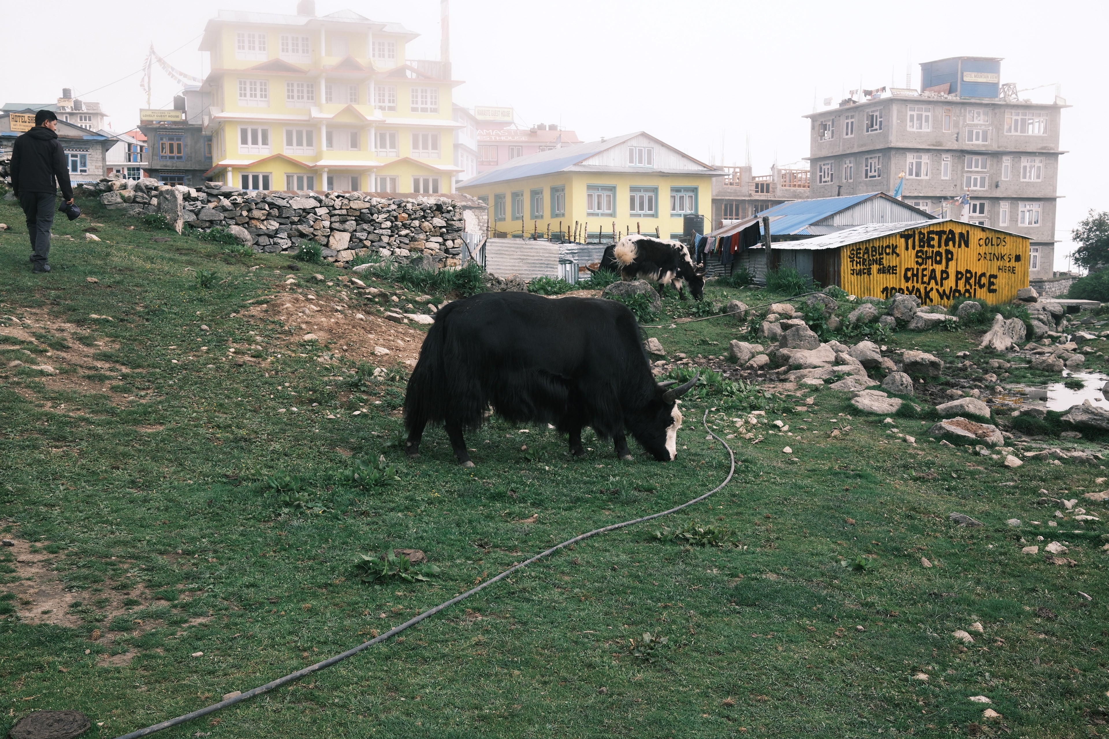 標高3,500mのランタン村。あちこちで馬やヤクが草を喰み、ほのぼのとした光景が広がっている。 2015年の地震で大きな被害を受けたが、新しい家やロッジも建てられ、少しずつ復興が進んでいる。