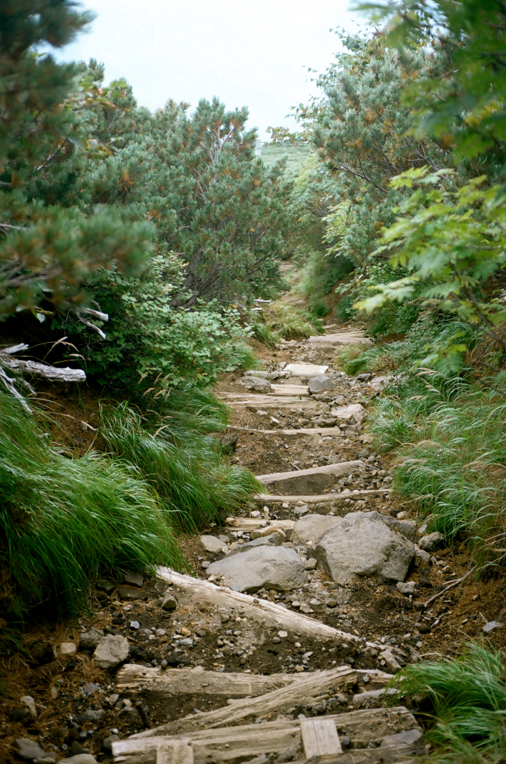 撮影があった日の夜は塩尻駅周辺に泊まり、翌朝の電車で木曽福島駅へ。そこからバスとロープウェイを乗り継いで、標高2,100mから歩き始める。気温は23℃くらいだったが、風の吹かない樹林帯は思ったよりも蒸し暑く、滝のように流れてくる汗を拭いながら登っていった。この日は平日で、時間も遅かったせいか、ほとんど人と出会わない。熊鈴の音を響かせながら、心細さを打ち消すように、やや早足で歩いた。道の途中には、真っ赤に色づいたナナカマドの実。まだまだ暑いが、秋の気配を感じて嬉しくなる…はずが、なんだか心が動かない。いつものような、はっとする喜びや、写真に収めたいという情熱が湧いてこない。