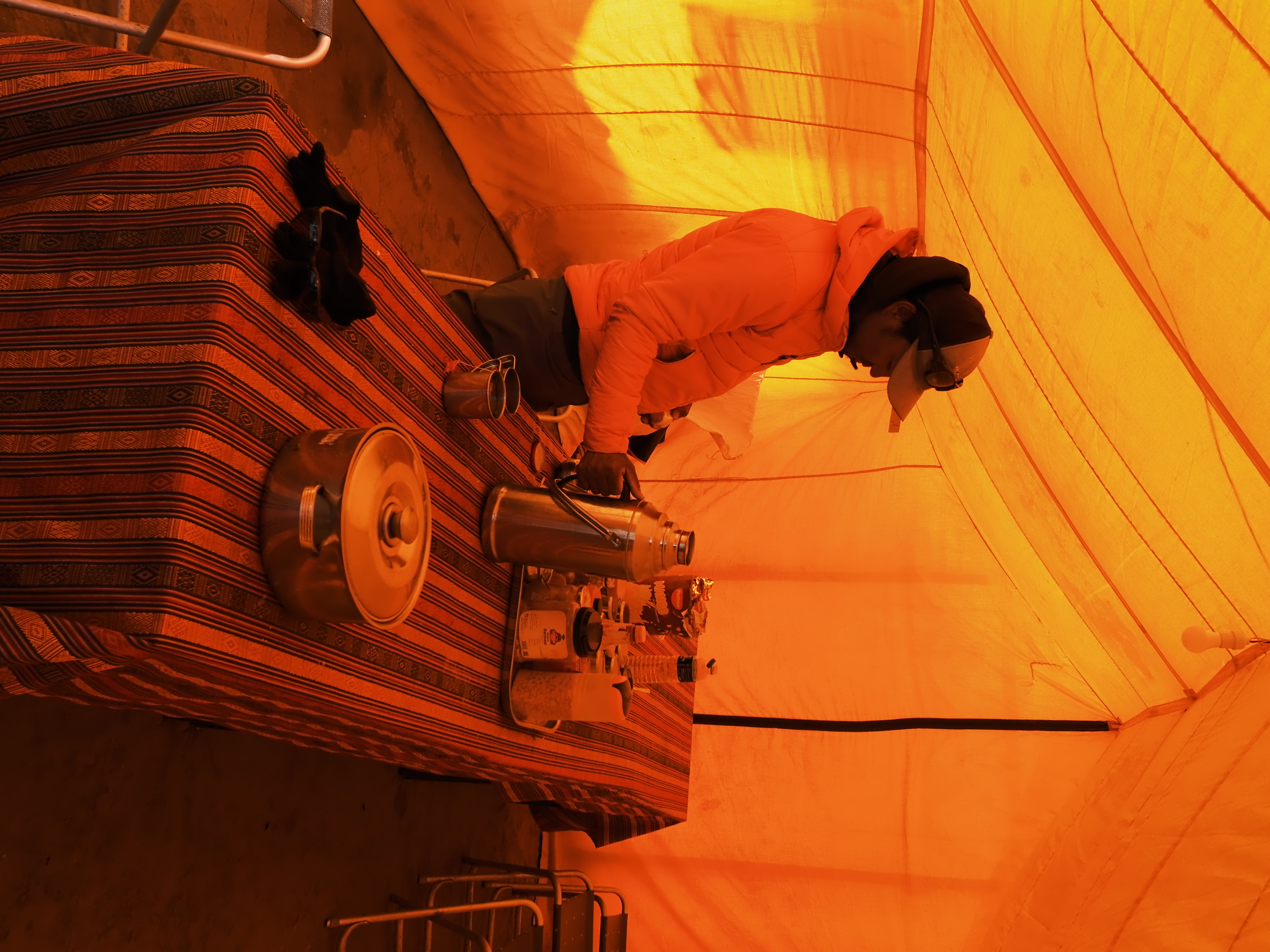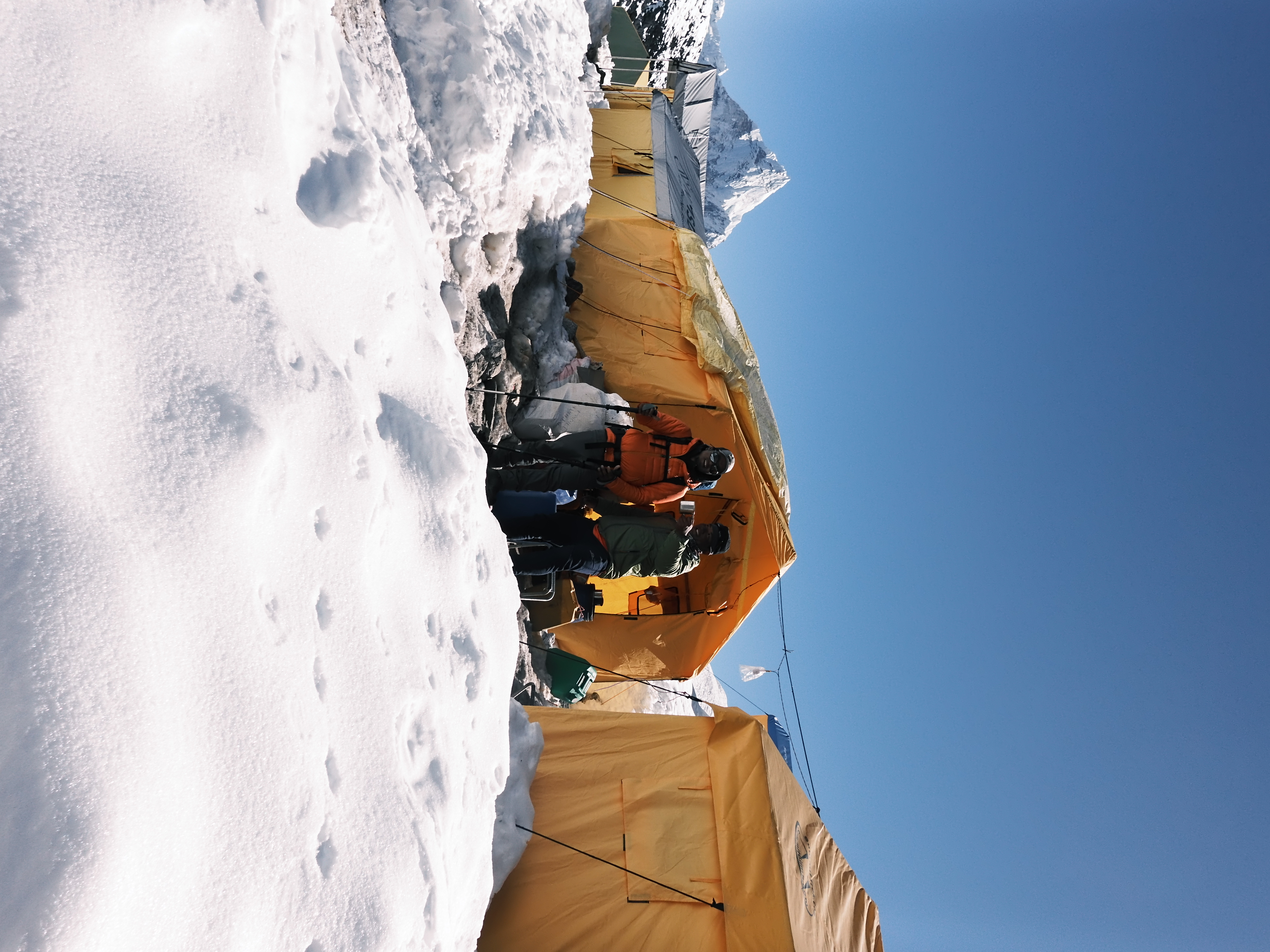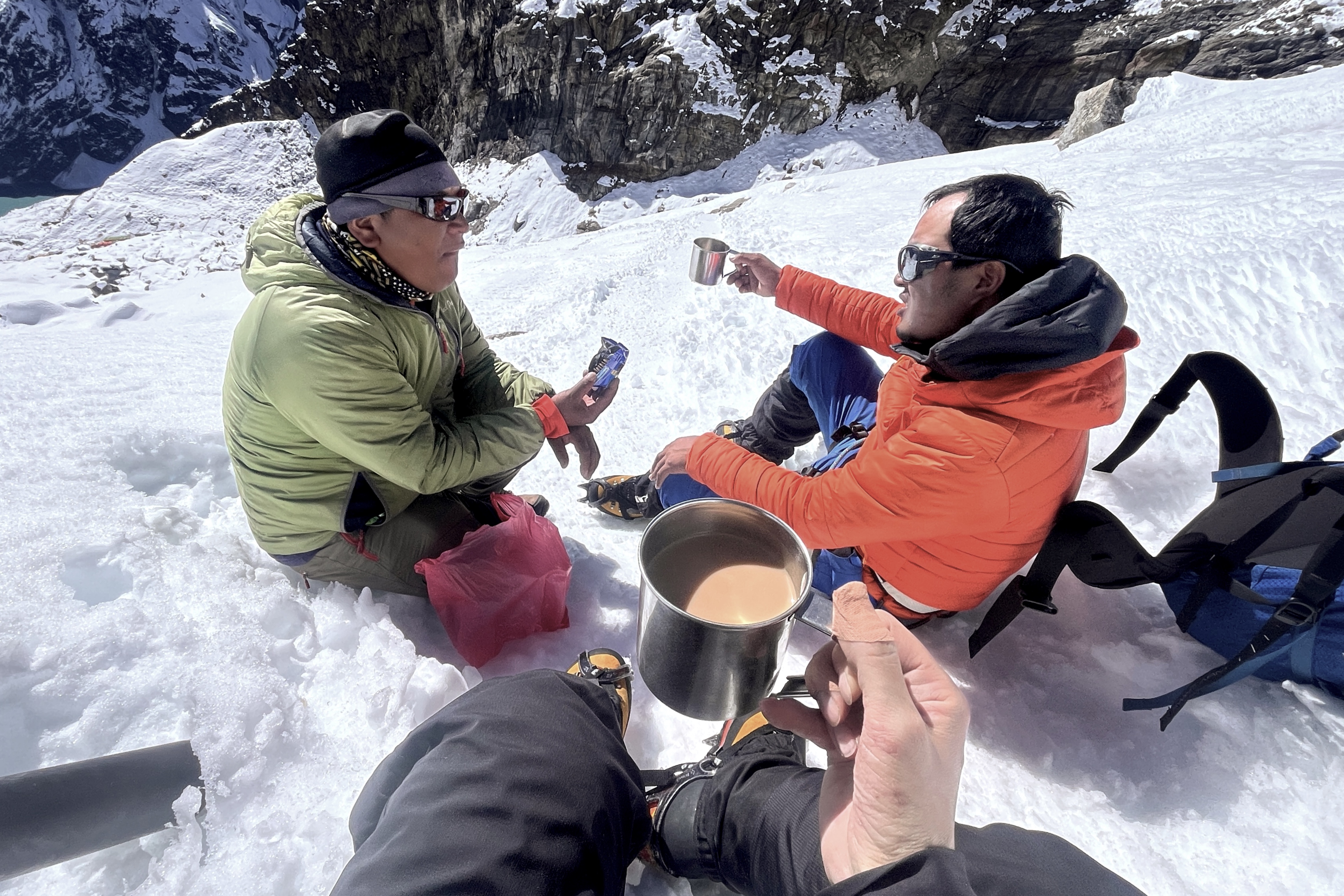 ポーターのパサン(左)はハイキャンプで待機していたが、なかなか戻ってこない私たちを心配して雪道を上がってきてくれた。右手にミルクティーの入った魔法瓶、左手にオレオとステンレスカップが入った赤いビニール袋を持った姿は、まるで救世主のようで忘れられない。彼は無事に登頂した私たちを労い、次々とオレオの袋を開け1枚ずつ手渡し、まだ空になっていないカップにおかわりのミルクティーを注ごうとした。こんなに幸せなティータイムは初めてだった。こうして、ふたりのおかげで無事にハイキャンプまで降りることができたのだった。