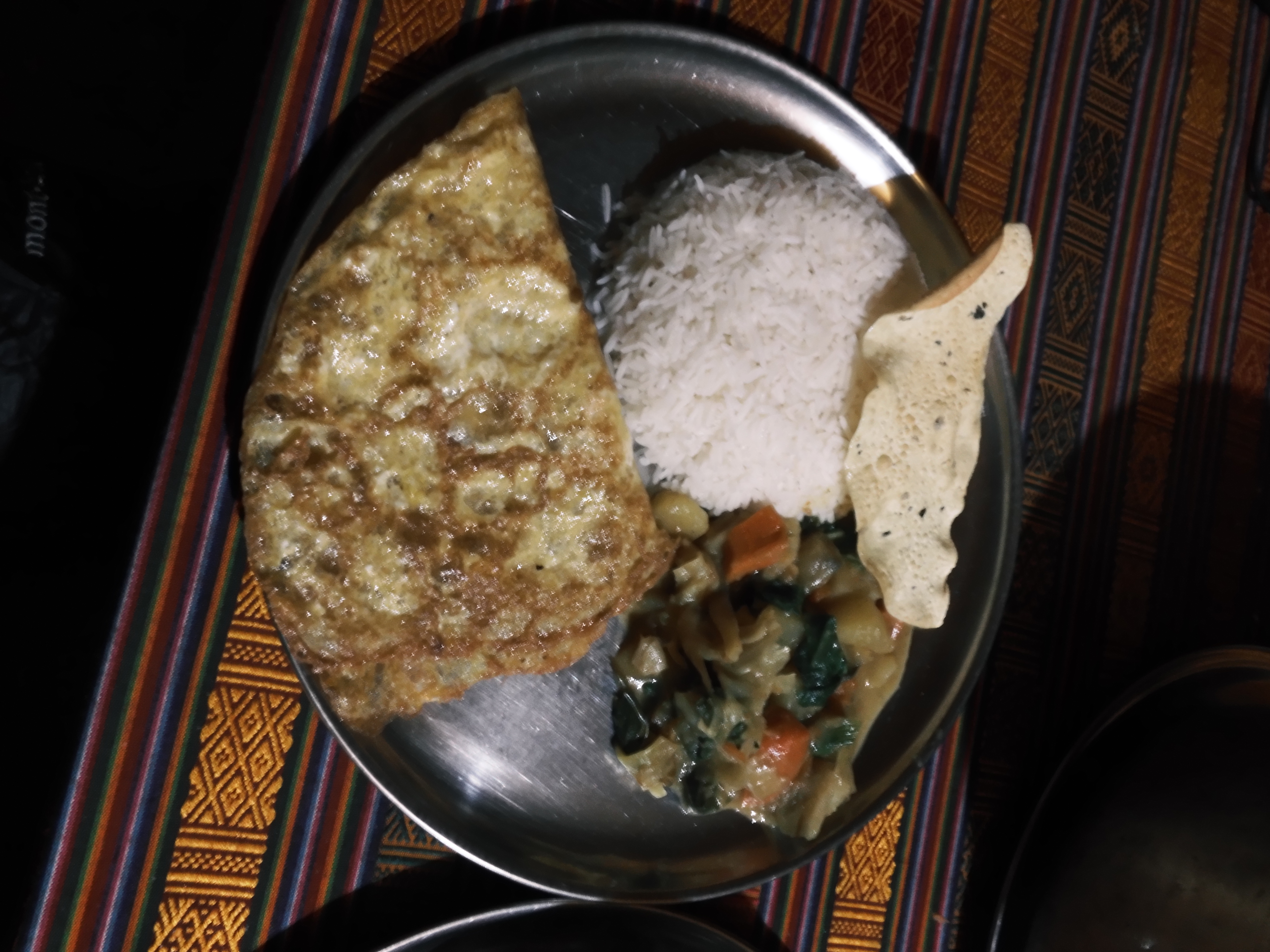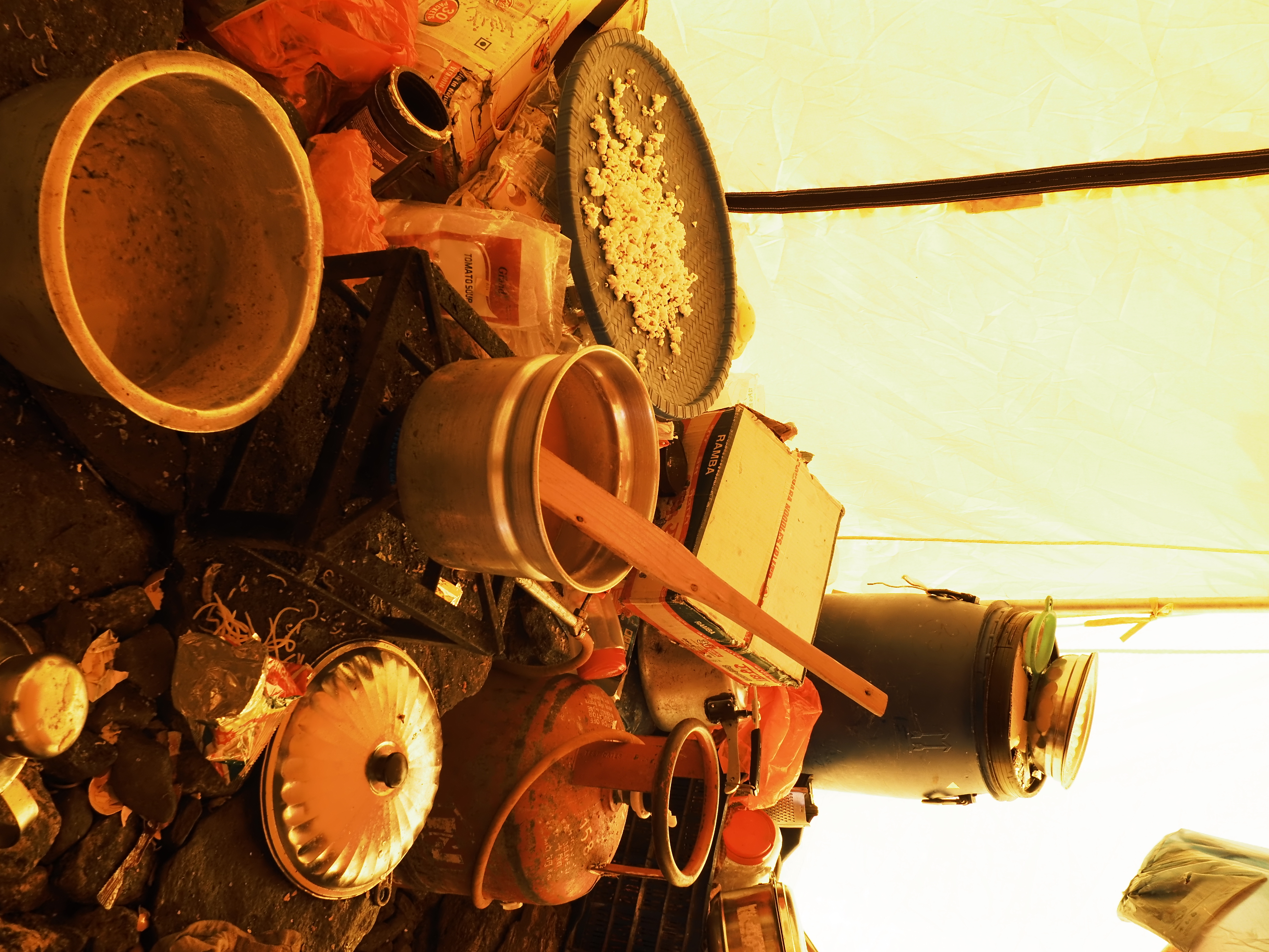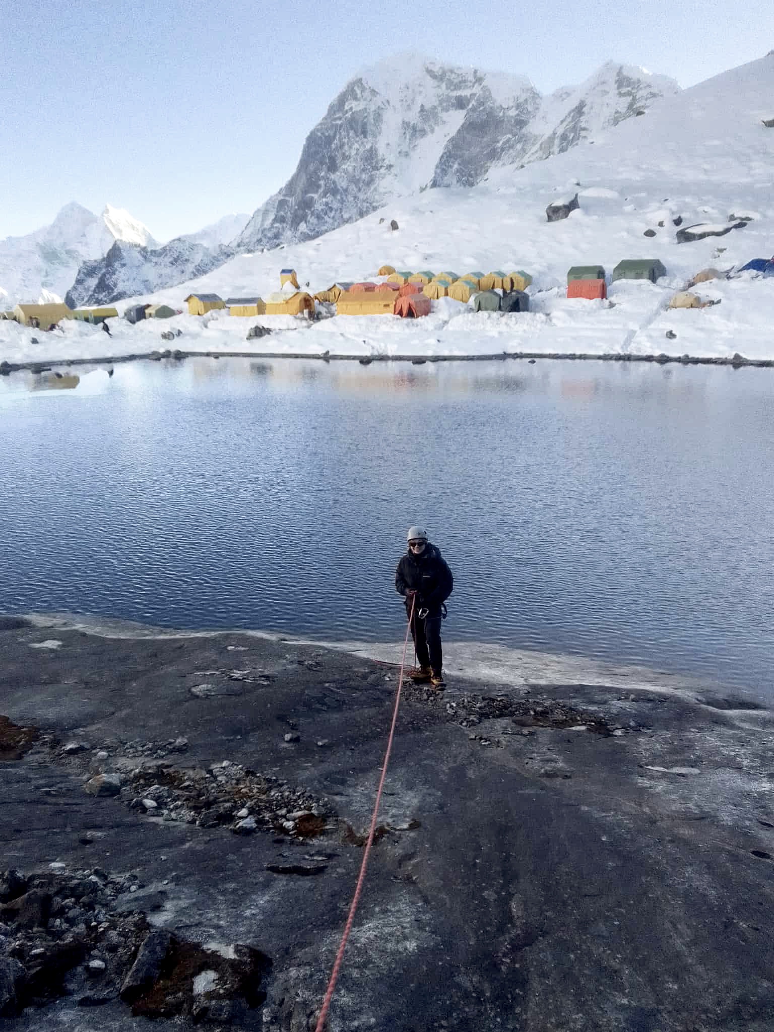 登山靴やアイゼン、ハーネスなどの道具をチェックしたあと、登攀器具の使い方のトレーニング。それから早めの夕飯にガーリックスープとダルバートを食べた。食欲はあるが、量が多すぎて残してしまう。19:00就寝。