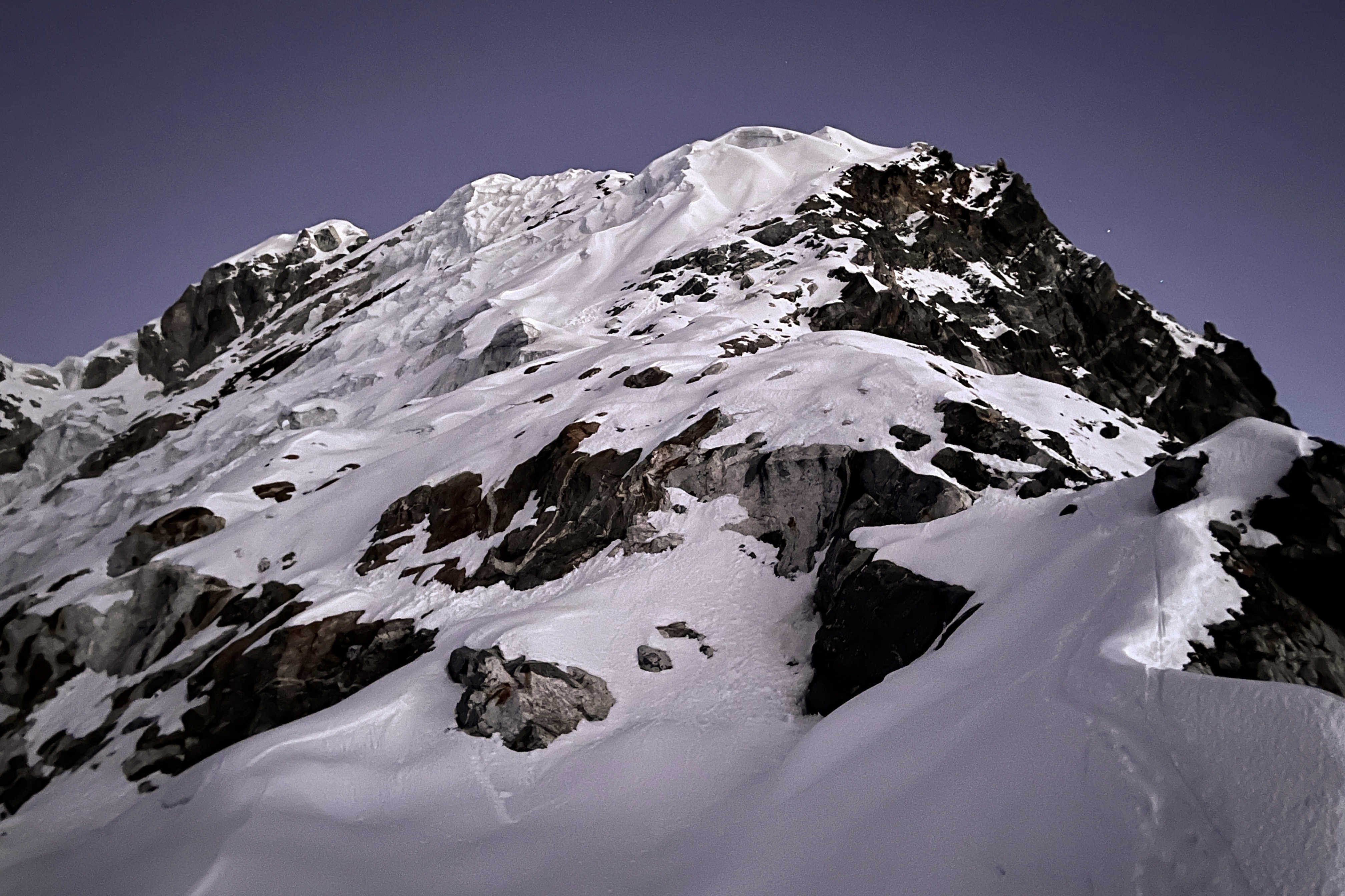 1:00起床。2:30、ガイドのダワとロープを結び、ヘッドランプを点けて山頂へ向けて出発。気温はマイナス15℃程度。足先は少し冷たいが、風がないのでそこまで寒く感じない。雪面をアイゼンで踏むザクザクという音と、自分の息の音を聞きながら、暗闇の中をただひたすら進む。