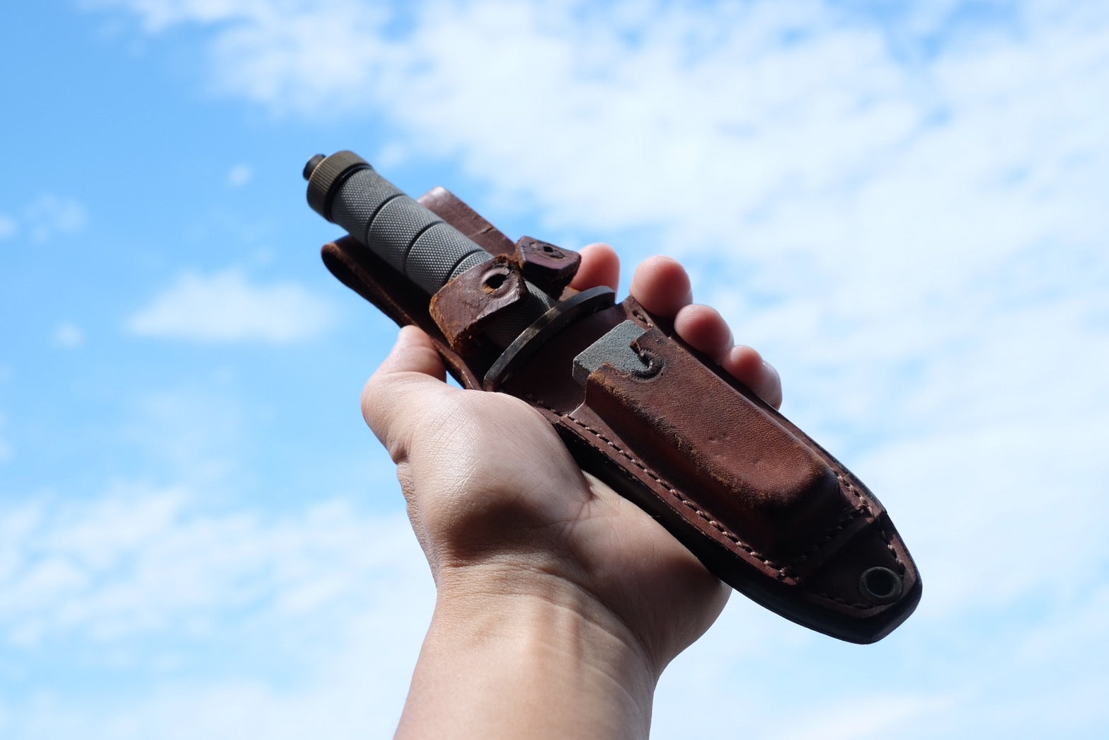 今回は自分のアウトドア道具の中で一番古くから使っているモノで、ランボーが持っていたような形状のサバイバルナイフです。確か購入したのは中学1年生くらい。友達と島に行って魚を釣ったり、採ったりして、それを食べてキャンプをしよう!!という話になり、その道中にある釣具屋で購入したナイフ。