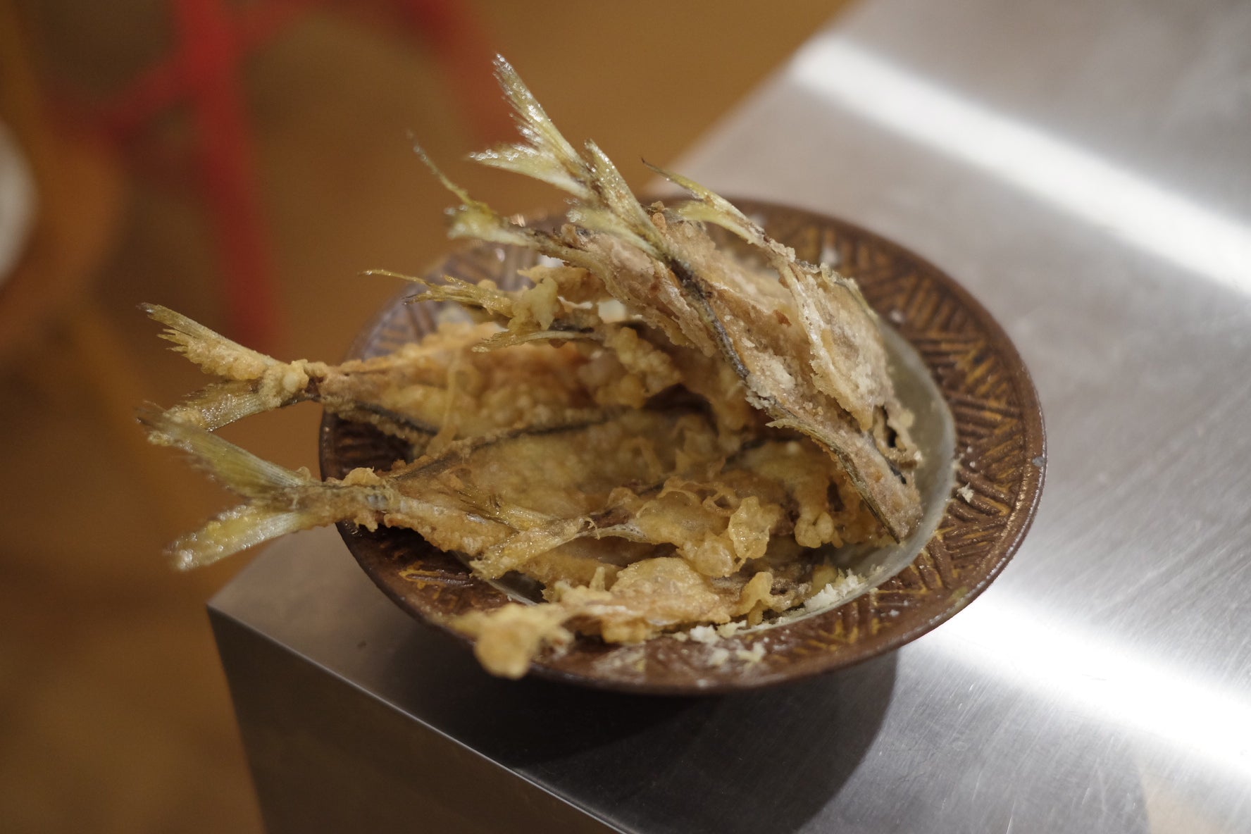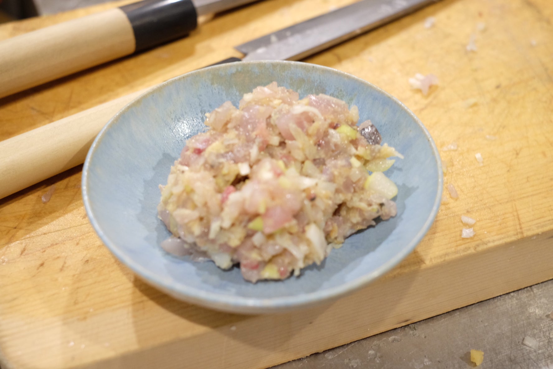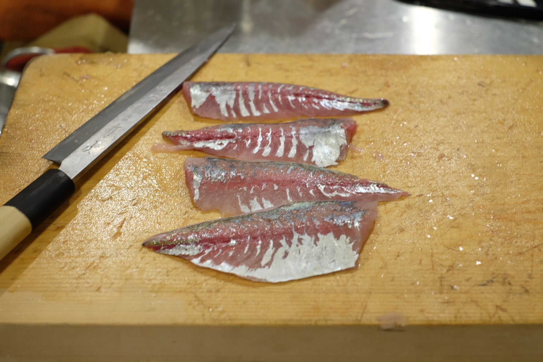 この連載のタイトル通り、やっぱり道具が好きで、料理に関してもまず道具を揃えたくなります。料理道具の中でも特に好きなのは包丁で、その中でも一番大切なものといえば、誕生日プレゼントでもらった、有次の柳刃包丁と出刃包丁です。名前を刻印してもらって、一生モノとして、将来的には子供たちに受け継いでもらおうと思っていたのですが、自分は左利き、息子も娘も右利き……残念ながら受け継いでくれる人はいなさそうなので、とことん自分で使い倒そうと思っています。とはいえ、それほど頻繁には使わず、たまに魚を捌いたり、肉を切ったり、時には野菜や焼きたてパンをカットしたりして、使うたびにその切れ味を楽しんでいました。しかし、月に数回の使用でも、年数が経つと見た目も切れ味も今ひとつになり、当初の輝きを失ってしまいました。普段使っている文化包丁や果物ナイフは自分で研いだり、シャープナーで簡単にメンテナンスしたりしていましたが、せっかく良い包丁なのでプロに任せてみようと思い、包丁研ぎのサービスに出してみました。これがもう驚きでした。