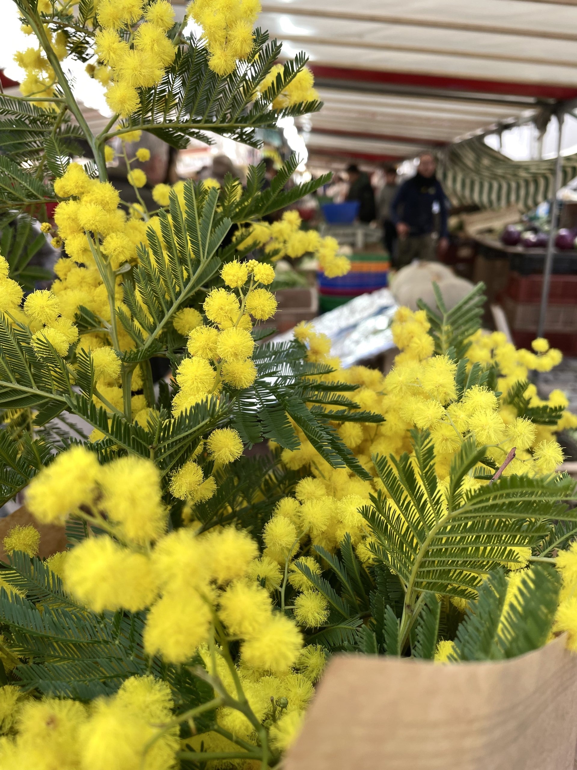 列に加わったら、前に並んでいた男性が軽く上半身をのけぞるようにして振り返った。「あ、お花が当たってしまったかな」と思ったと同時に、その男性が「Merci (ありがとう)」と言った。それを受けて私は、ミモザの香りをかいだ。「それほどではないけれど、でも少し、香り、しますね。」と言うと、彼は、いちばん飛び出ていたひと枝を軽く鼻先に寄せた。「いや、十分ですよ。十分、香っている。ミモザだ」