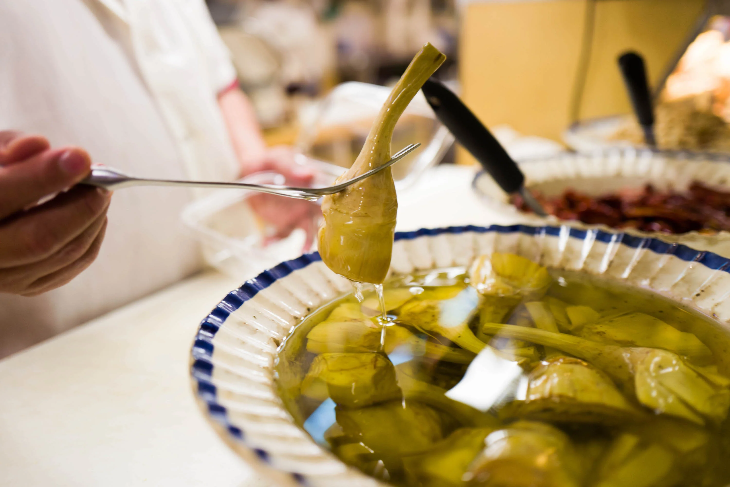 「んー!!」。香ばしい茄子と生ハムとチーズ、アクセントになったアンチョビ、そしてフルーティーなオリーブオイルが実においしかった。こんなパニーニ、いや、おいしいパニーノは初めてだ。トスカーナパンの小麦の独特な風味も最高だ。おまけしてくれたアーティチョークのマリネもおいしかった。