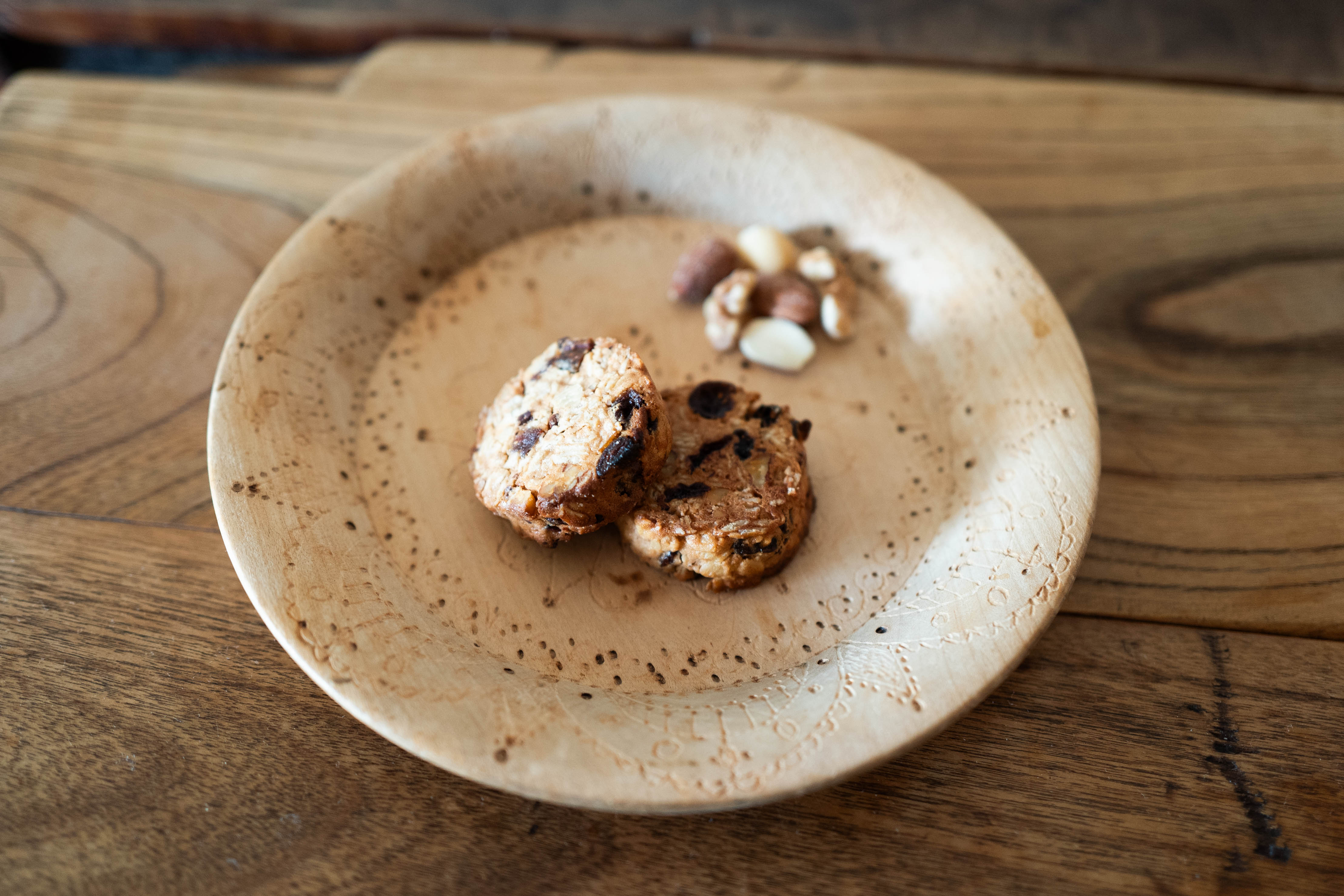 フィンランドのヘルシンキを旅した時に出合った木の平皿です。削り出した皿の表面に手仕事による柄が施されています。僕の推測では、何も変哲のないプレーンな木の皿を見たおかあさんが、細いキリで点をいくつも作って、いろいろな柄を描いたのではないかなと。子どもの絵のようで、あまり上手でないのがいいですね、かわいくて。パンやクッキー、ナッツなどを置くと、テーブルの上がなんだかとてもあったかい風景になります。