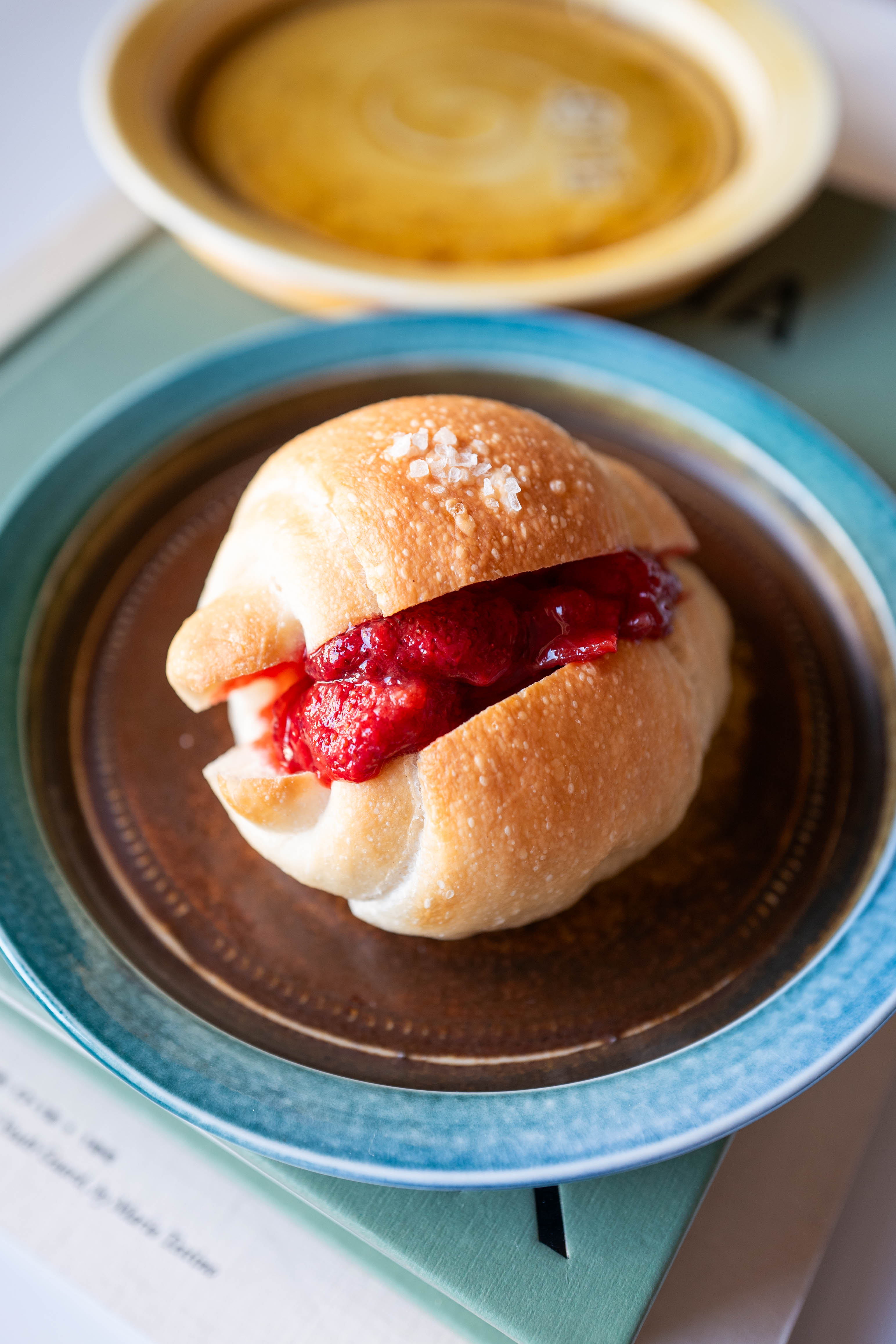 今日は自家製のいちごジャムをはさんだバターロールをのせてみた。お皿の独特な配色が、バターロールといちごジャムのおいしさを引き立てて、ちょっとファンタジーな世界が生み出されている。そう、スティーブ・ハリソンの、そのファンタジーな世界観がぼくはとても好きなんだ。