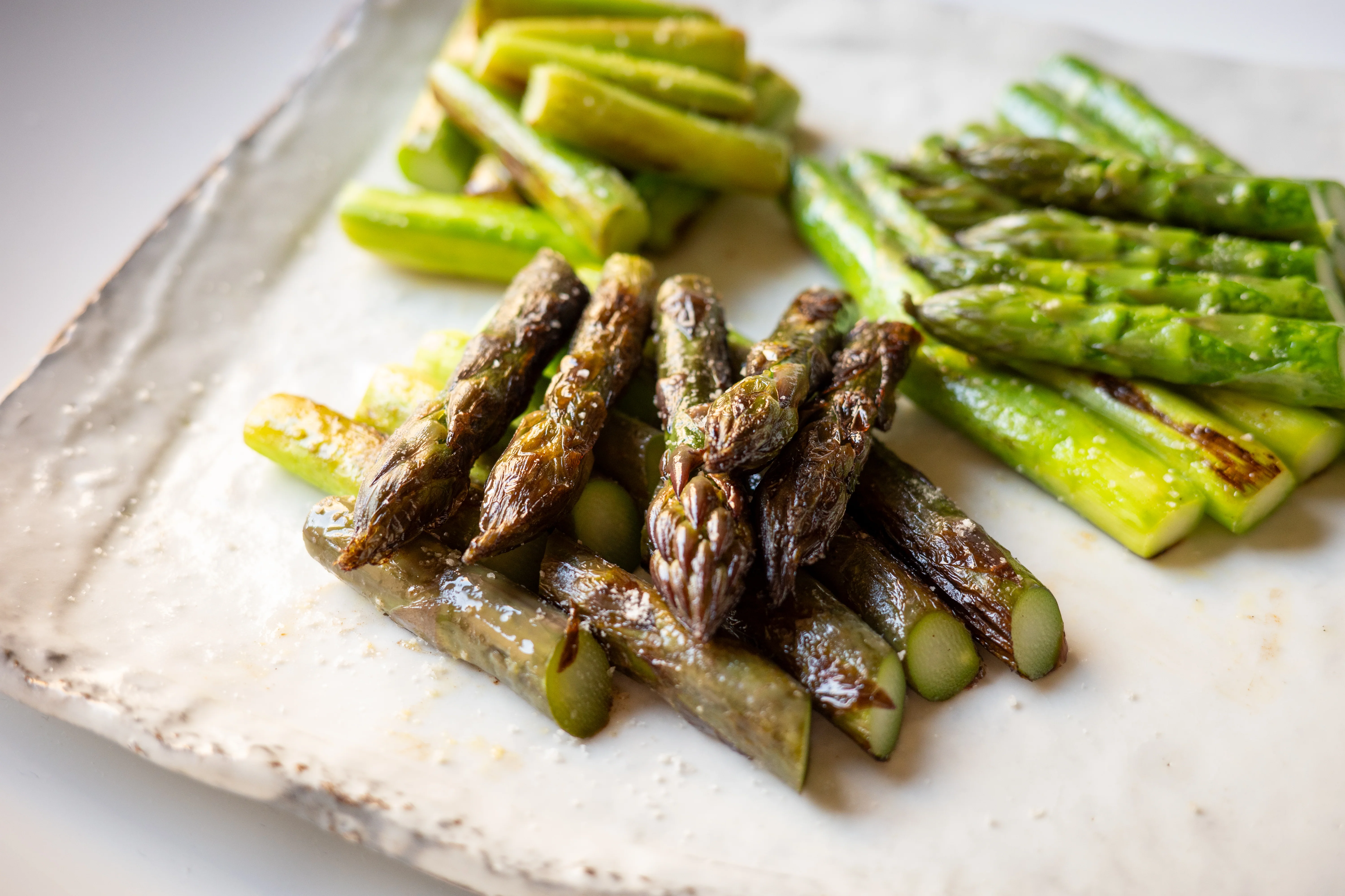 アスパラガスが重ならないような大きさのフライパンを強火にかけて、油(Kさんはグレープシードオイル)を入れて、しっかりと熱してからアスパラガスを並べる。アスパラガスもフライパンも動かさない。焼き目がうっすらとつくまで1分くらい焼く。フライパンにバターを入れて溶かし、フライパンを少しゆすってアスパラガスを返す。スプーンを使ってアスパラガスに溶けたバターを回しかける。全体に火が通ったら完成。アスパラガスは焼きすぎないのがコツ。食べやすい大きさに切って、皿に盛ったら、塩をふたつまみくらい振りかけて食べる。