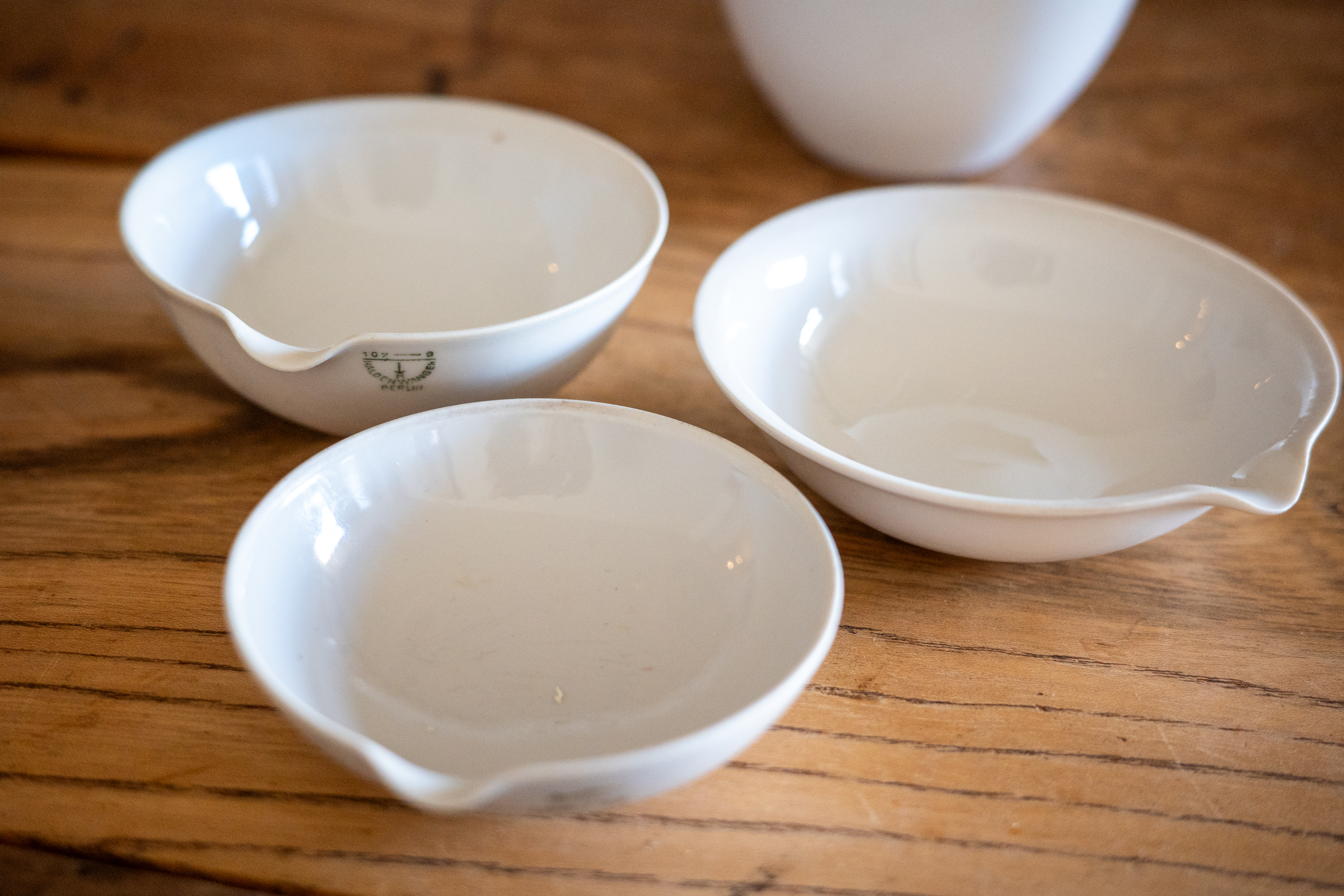 調べてみると、ドイツの「Haldenwanger Berlin」という1865年から続く、実験用セラミックを作るメーカーのものだとわかった。手に持つととても軽くて、その味気なさがひとつの味というような魅力になっている。これぞ「形状は機能に従う」というバウハウス的なデザイン思想とでも言うのだろうか。もちろん、手仕事で作られたあたたかい食器が好きだけれど、ときにはこういった装飾を排除したプロダクトもいい。