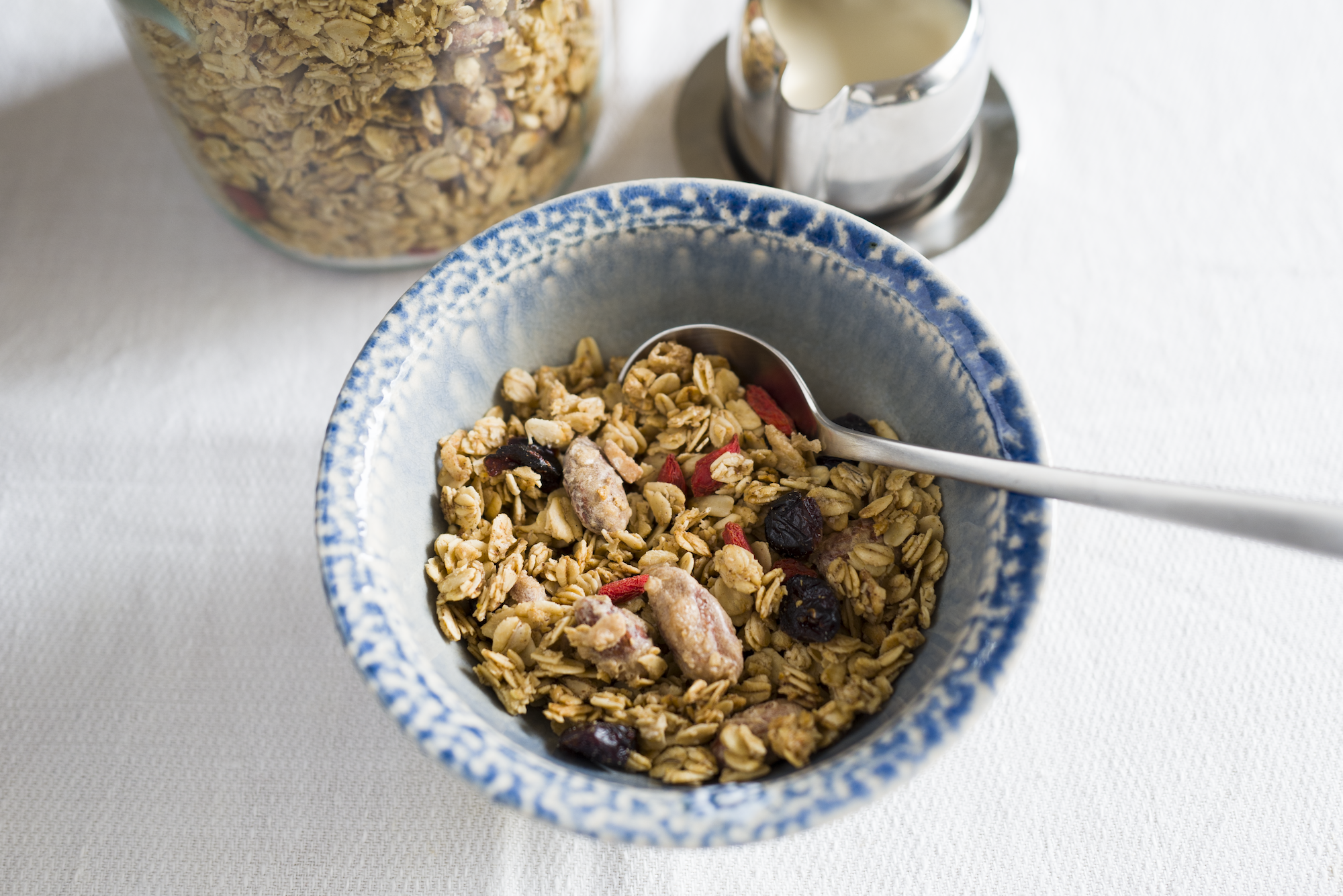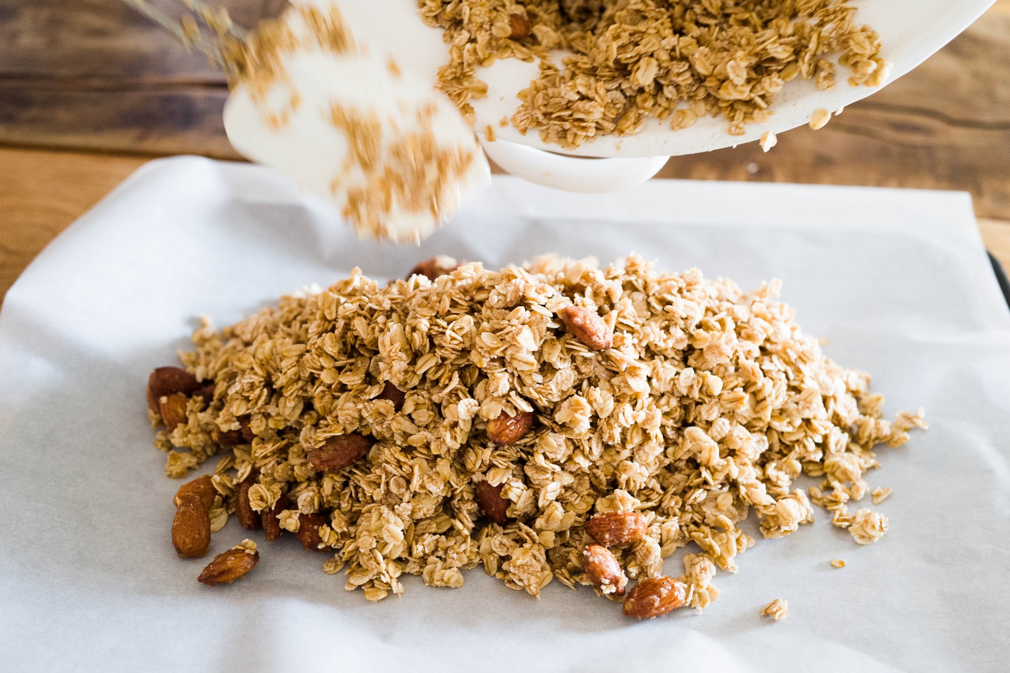 オーツ麦は上質で大粒を選び、有機のアーモンドはていねいにキャラメリゼする。油はココナッツオイルを控えめに使い、甘味は後味の良いてんさい糖を選んだ。ほんの気持ち程度にシナモンを添えると、ひと口目の印象がふわっと華やかになる。なるほど、こうすればオーツ麦の食感は他のどんなグラノーラにも負けないサクサク感になる。焼き加減や、途中で混ぜる手間もおいしさにつながることがわかった。