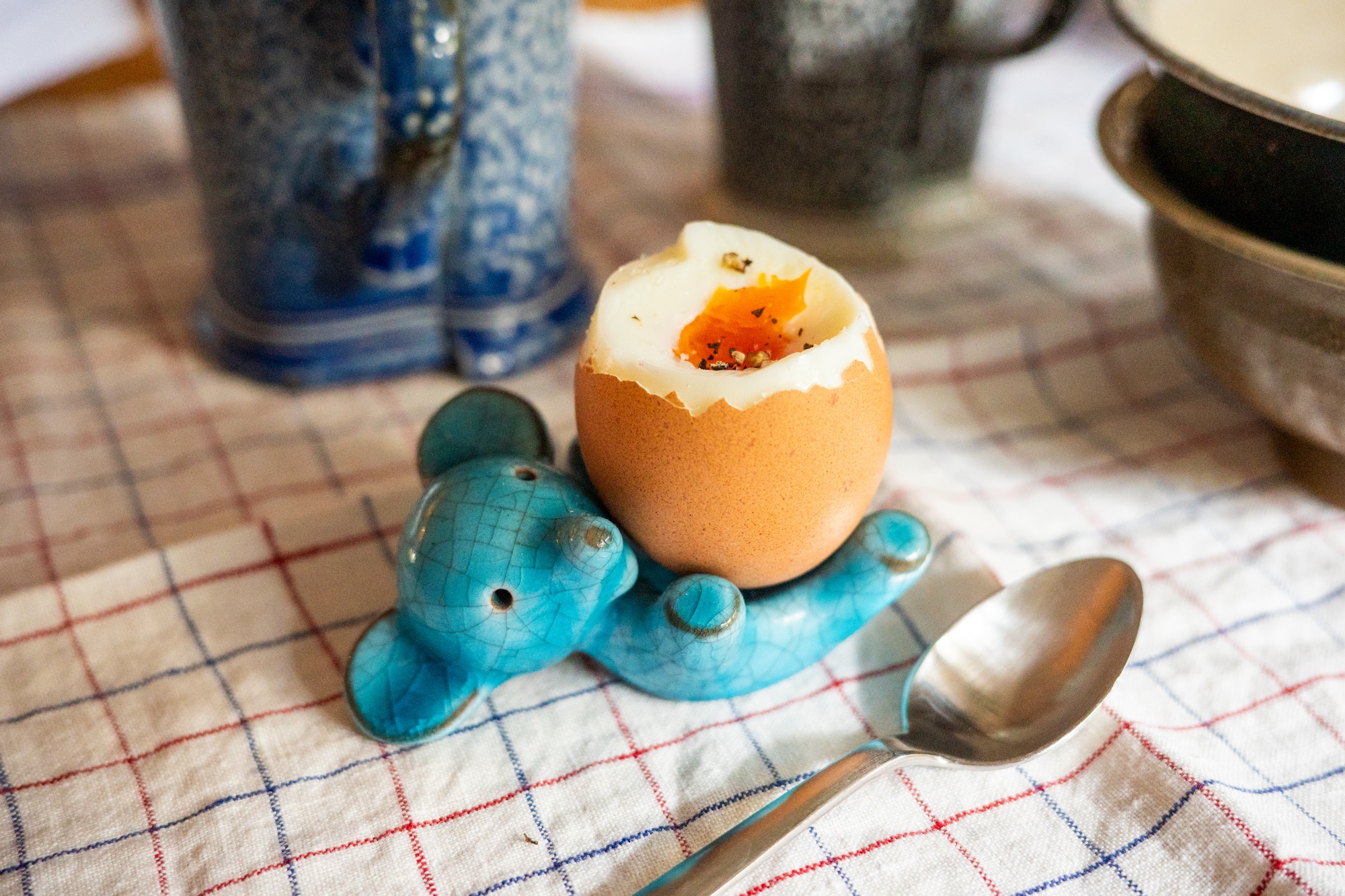 エッグスタンドは、オーストリアの工芸作家、ウォルター・ボッセが作るマジョルカ焼きの青いクマ。寝転がったクマが、手と足を使って卵を支えているのが微笑ましい。もう何年も我が家の食卓にいるから「青いクマさん」と呼んでいる。